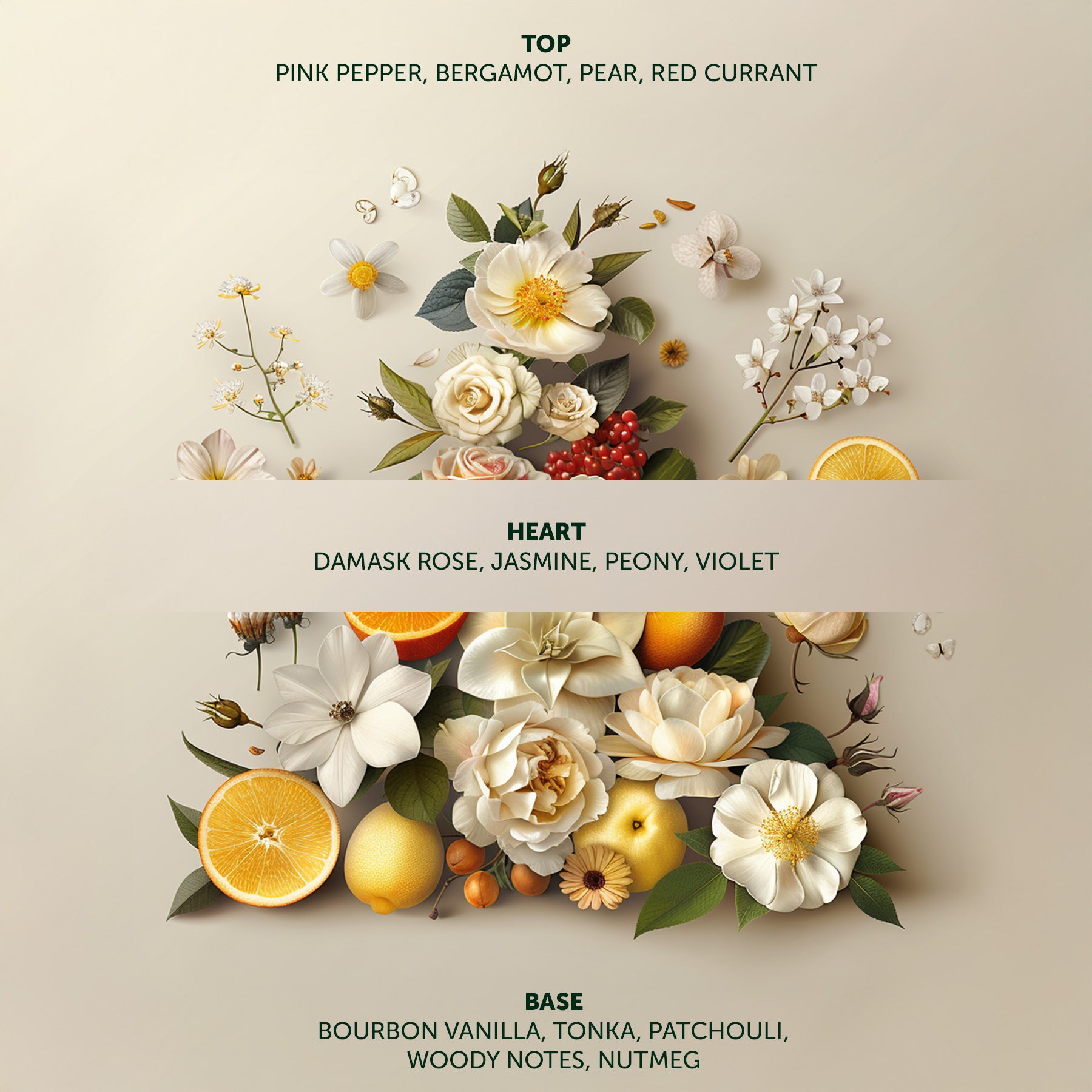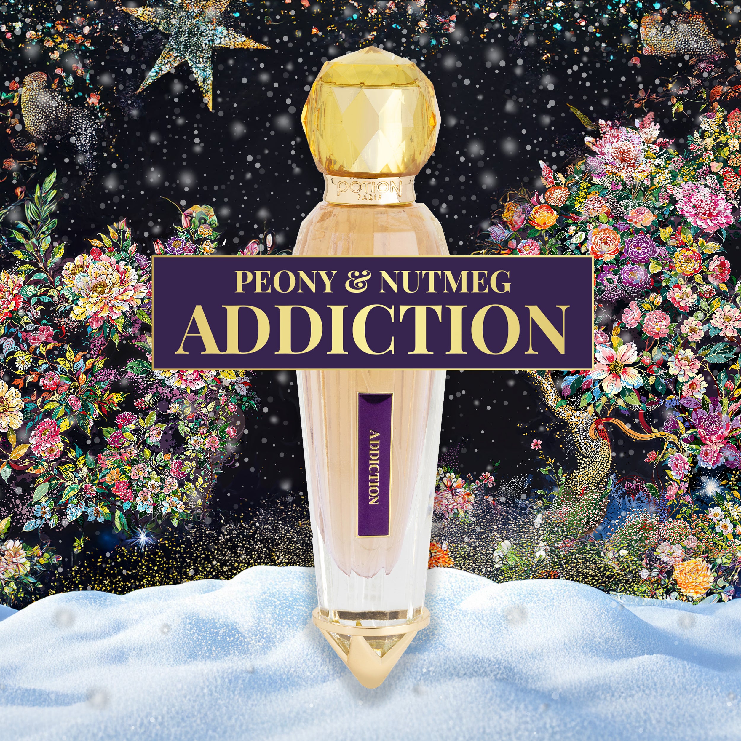 Every ingredient in Addiction is meticulously selected to create an unforgettable olfactory experience. The vibrant opening of pink pepper, bergamot, pear, and red currant sets the stage with a burst of energy and intrigue. At its heart, Damask rose, jasmine, peony, and violet weave a delicate and romantic floral melody. The base anchors the composition with the creamy warmth of bourbon vanilla, sultry tonka, and earthy patchouli, all brought to life by an unexpected twist of nutmeg.